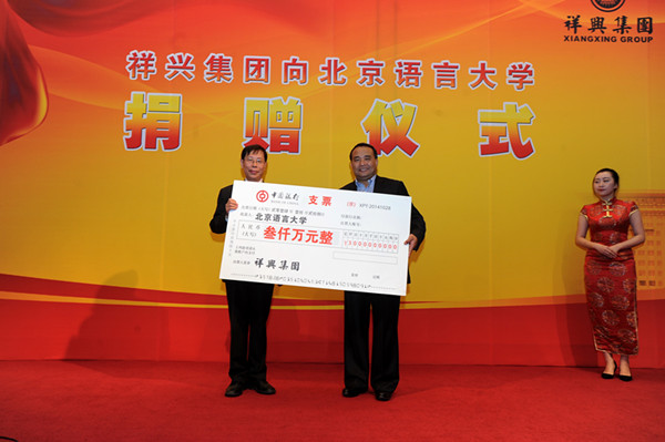 为推动我校国际教育事业发展,助力学校创建世界一流语言大学目标,祥兴集团董事长薛行远先生向我校捐资3000万元。崔希亮校长代表学校接受捐赠支票,并为薛行远先生颁发捐赠证书及学校纪念品。