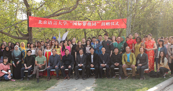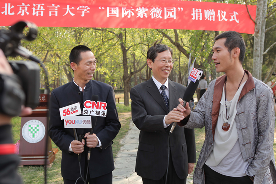 在素有“小联合国”美誉的北京语言大学东门,200棵美丽的紫薇树在春风中舞动。4月20日下午,“国际紫薇园”是中国“紫薇大王”宋和平先生向北京语言大学捐赠紫薇仪式正式举行,这是宋先生响应国家PM2.5优化环境的政策,绿化大学校园的善举。这个紫薇园被命名为“国际紫薇园”,展现北语办学国际化,桃李遍全球的特点。北京语言大学校长崔希亮、宋和平、艺术家田七、国家一级作曲家卞留念、中央电视台体育解说员韩乔生、著名演员计春华、亚运会音乐总导演郝一平、世界悬崖绝壁跳水狄焕然等出席活动。