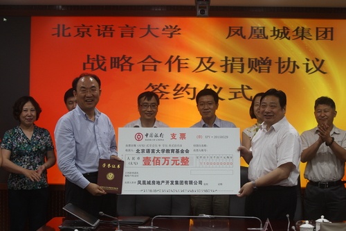 2015年5月29日,北京语言大学与凤凰城集团的战略合作与捐赠仪式在主楼909室隆重举行。凤凰城集团董事长周明德,我校党委书记李宇明,凤凰城集团有关领导及我校汉语速成学院刘长征院长、孔子学院陈丽霞主任、教育基金会金珂秘书长,汉语教学研究基地、校办、发展规划处等领导出席,签约仪式由发展规划处李进处长主持。