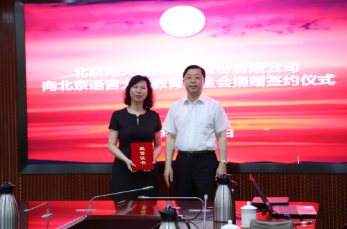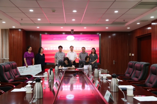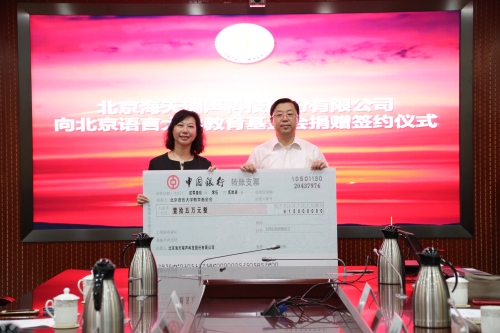 在现场嘉宾的见证下,贺琳董事长与北京语言大学教育基金会金珂秘书长共同签署捐赠协议,其捐赠款15万元将用于北京语言大学语言科学院的发展与建设。刘利校长为贺琳女士颁发了捐赠证书,捐赠仪式在全场热烈的掌声中落下帷幕。