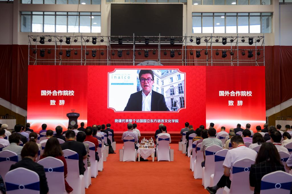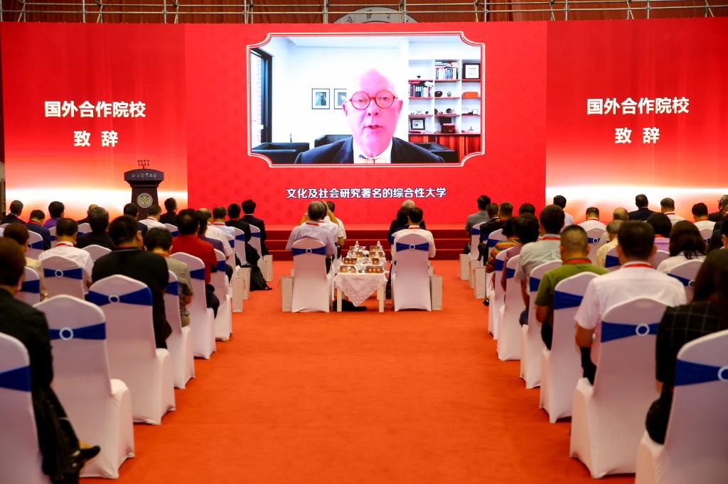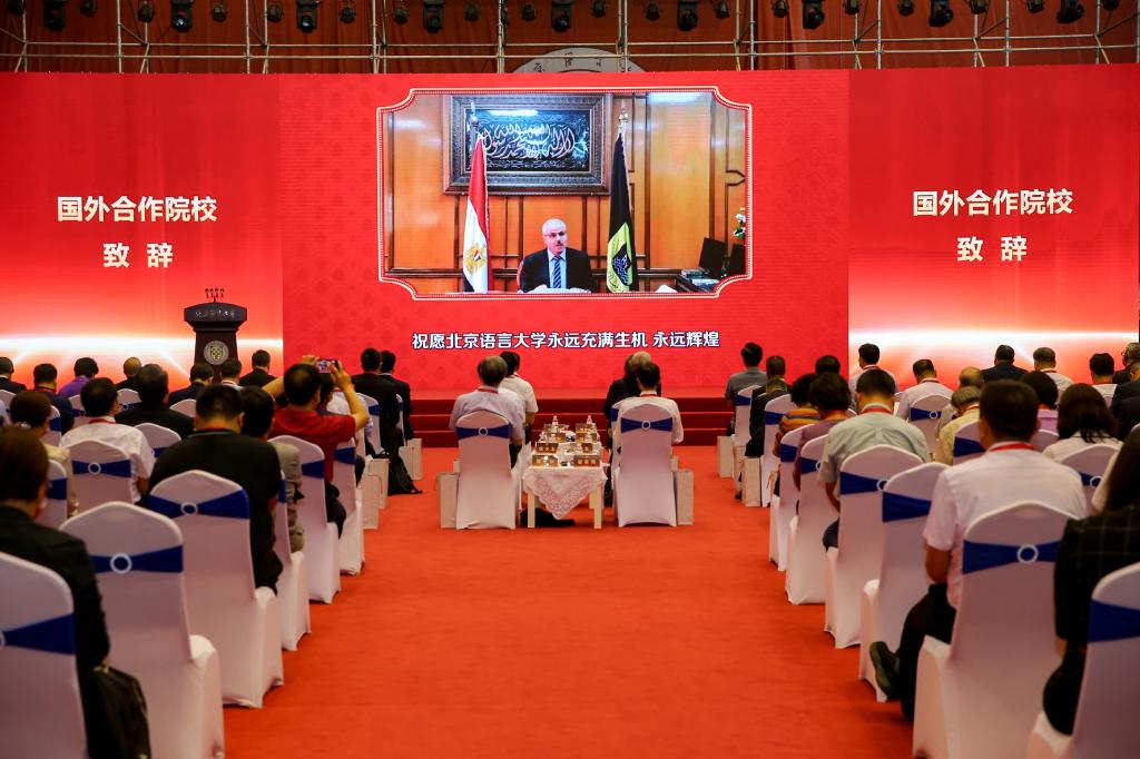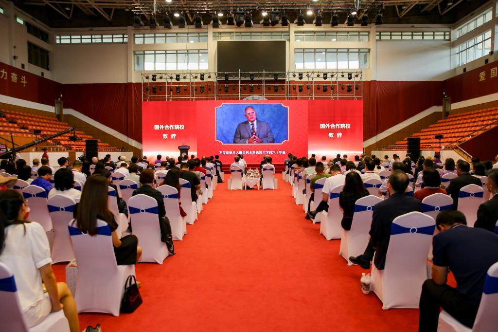 五大洲的外方合作院校校长代表通过视频发表致辞。他们是澳大利亚麦考瑞大学校长布鲁斯·唐顿,埃及苏伊士运河大学校长纳赛尔·曼杜尔,法国国立东方语言文化学院校长让·弗朗索瓦·胡塞,泰国玛希隆大学校长班冲·马海萨瓦利亚,美国西密歇根大学校长爱德华·蒙哥马利。他们高度评价了北语建校60年来为中外教育交流合作、中国与世界各国友好交往做出了巨大贡献,希望北语与外方合作院校继续携手向前,不断深入务实合作,共同分享发展机遇,为推动构建人类命运共同体贡献力量。