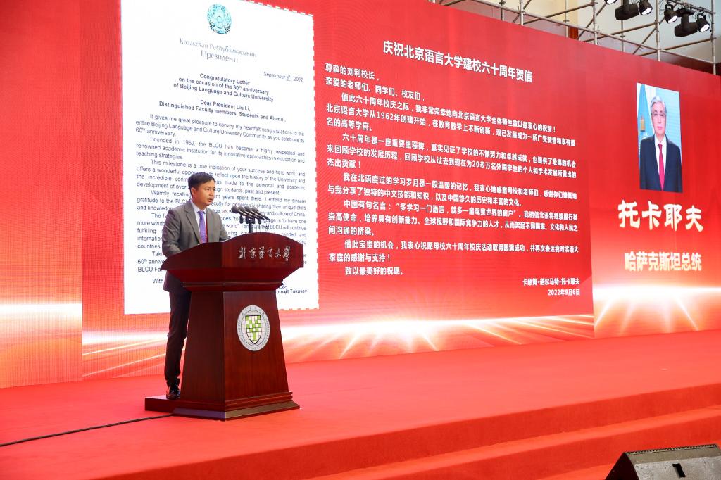 今年恰逢中国和哈萨克斯坦建交30周年。哈萨克斯坦共和国总统、校友卡塞姆·托卡耶夫发来贺信,表达对母校的殷殷之情和美好祝愿。哈萨克斯坦共和国驻华使馆政务参赞、校友巴格兰宣读贺信。卡塞姆·托卡耶夫总统回顾了在母校度过的那段温暖的学习岁月,衷心感谢母校和老师们教授其汉语知识技能和悠久深厚的历史文化。他相信母校将继续履行崇高使命,培养具有创新能力、全球视野和国际竞争力的人才,从而架起不同国家、文化和人民之间沟通的桥梁。